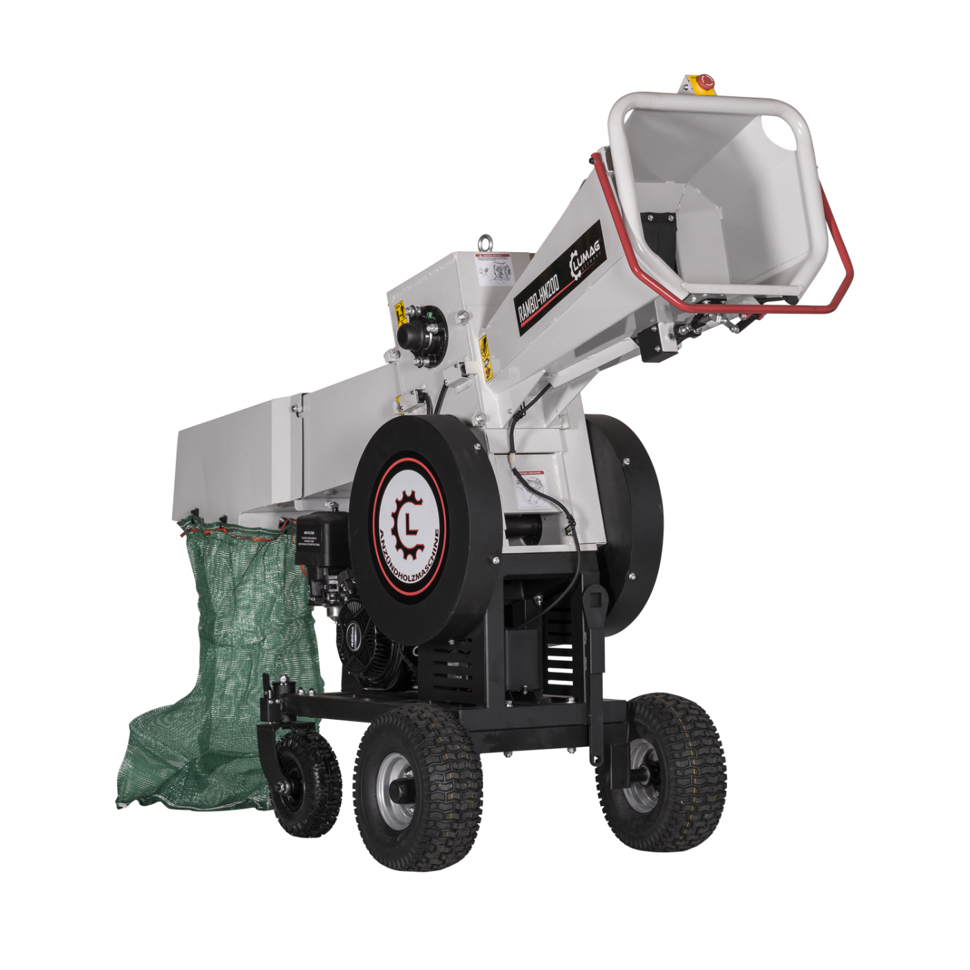 Bardzo mocny rębak drewna opałowego Lumag RAMBO-HM200, wyposażony w silnik benzynowy o mocy 13 KM i 2 bębny nożowe.
