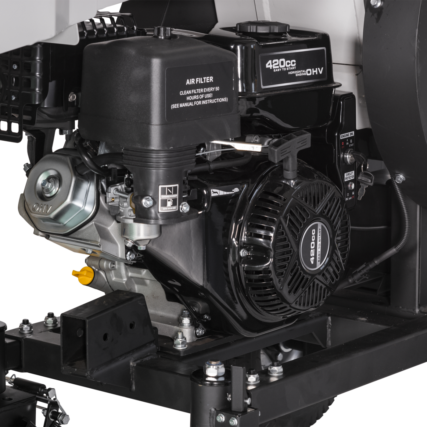 Mocny silnik o mocy 13 KM zapewnia cięcie na kawałki nawet gałęzi o średnicy do 120 mm. Duży i wyjątkowo długi lejek do napełniania sprawia, że napełnianie maszyny jest bardzo łatwe. Maszyna wyposażona jest w rozrusznik elektryczny. Akumulator w połączeniu z rozrusznikiem zapewnia łatwe uruchomienie maszyny za pomocą kluczyka. Urządzenie ładuje także akumulator.